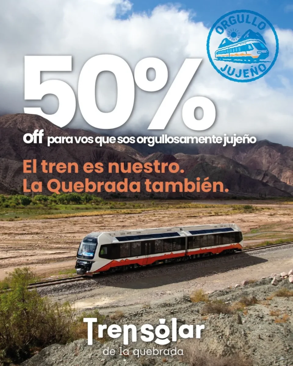 Desde el 10 de septiembre hasta el 14 de diciembre de 2025, los residentes de la provincia que acrediten domicilio en su DNI podrán acceder a un 50% de descuento en el valor del pasaje, en el Tren Solar de la Quebrada reduciendo el costo de $10.000 a $5.000.